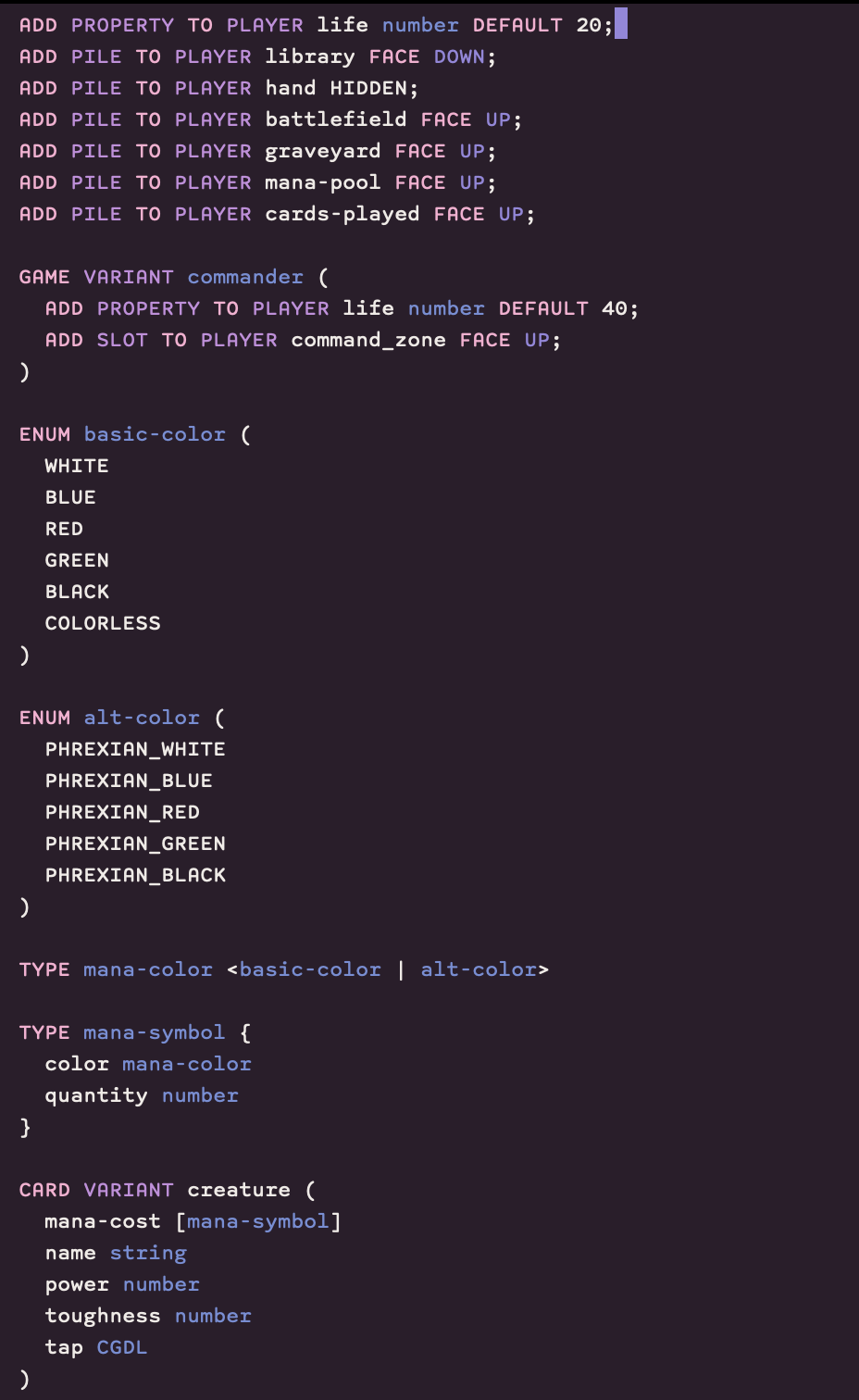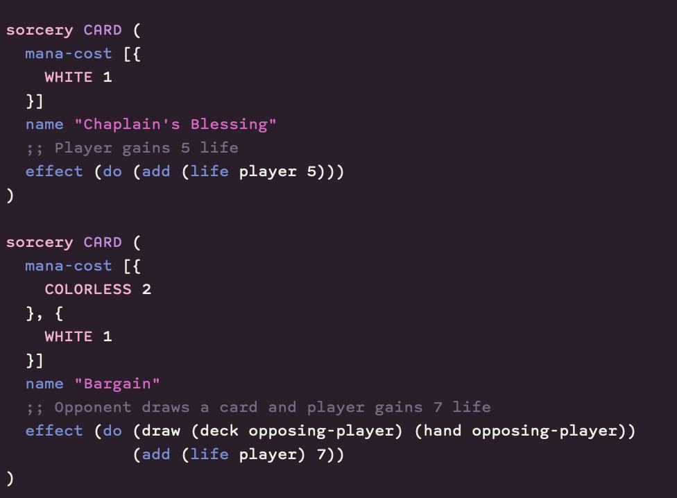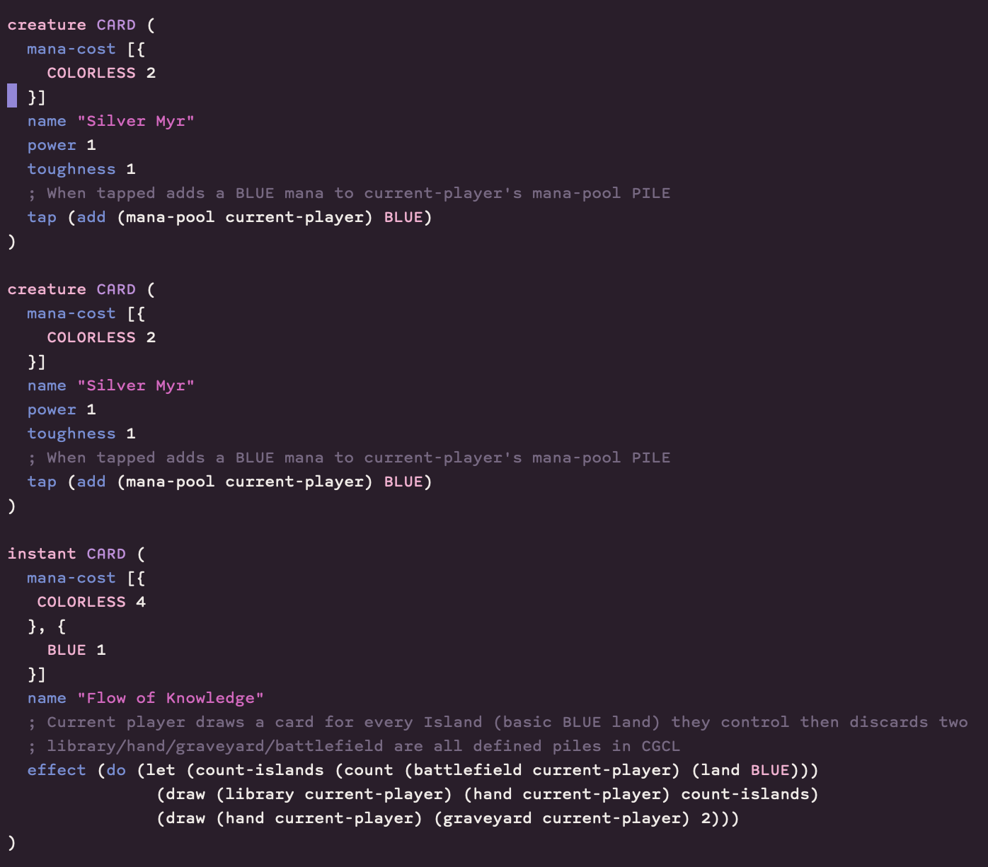 For this hackathon, I implemented both Go Fish and a basic version of Magic the Gathering using the new languages CGCL (Card Game Configuration Language) and CGDL (Card Game Design Language). If you're interested in some of the rationales or decisions behind this project, check out the blog post linked below.